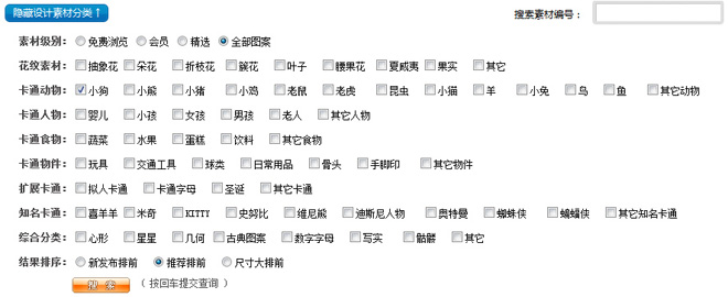 在‘全部素材’里找屬于‘小狗’類型的設(shè)計素材,并按‘推薦度’來進行排序。
