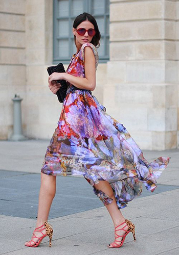 雪紡印花連衣裙配高跟鞋,大朵的印花更加絢麗繽紛,彰顯華貴浪漫,輕盈飄逸的裙擺隨風輕舞,簡直美上天。