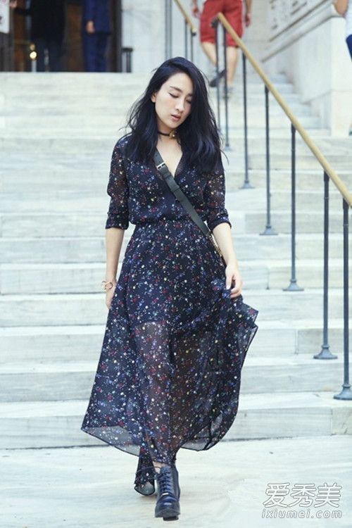 馬蘇街拍穿深色小碎花裙配黑色短靴,打造秋日田園風(fēng),清新唯美,飄逸迷人。