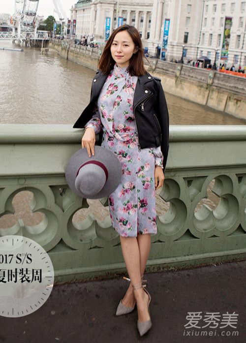 江一燕用黑色皮夾克配淺紫色印花連衣裙,踩著尖頭高跟鞋,非常優(yōu)雅淑女,帥氣的外套穿出個(gè)性。