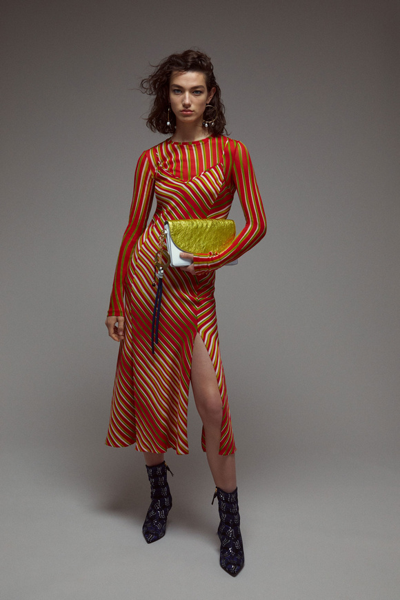 Diane von Furstenberg的設(shè)計(jì)師Scotsman Jonathan Saunders從一開始,他已經(jīng)把時(shí)尚融入到他斜裁的印花連衣裙里。結(jié)合黑色和桃色的粉紅色調(diào)。分層印花。他確實(shí)有很多面料的開發(fā),其中最引人注目的是他想出這款Lurex手繪點(diǎn)打印。